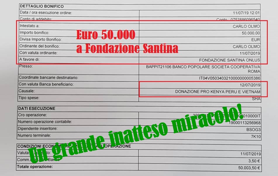 Ma non sono subito importanti i 50.000 euro, somma pazzesca, ma la trama che si è costruita attorno a questa generosa offerta: la trama di donne di speranza che lottano contro la violenza e la storia di un Uomo di speranza, Carlo, che lotta contro la violenza… non riuscivo più a uscire dalla chiesa in preda al ragionamento con Dio, con la Madonna e con la Santina, poi dopo il vespro mi metto al telefono e chiamo alcuni amici: chiamo Olinda in Perù e chiedo di dire 10 Ave Maria perché si avveri quella promessa, chiamo Jimmy in Kenya, Men in Vietnam, Emanuele e Roberto a Bergamo, Roberto e Marienza a Roma, Franca a Roma: insomma mezzo mondo nella notte di ieri in preghiera per questo gesto che stava per avvenire pregando Dio e la Madonna che ci facessero capaci di usare bene tutti quei soldi solo per il bene dei nostri poveri. Nelle mie telefonate leggevo incredulità, stupore e meraviglia: sono le caratteristiche con le quali si deve ricevere la grazia di Dio…Anche nella grande chat degli amici di Santina una misteriosa richiesta di preghiera. Tutti in attesa della buona notizia finché… oggi alle ore 12.10 il messaggio whatapp che mi provoca infarto! Una foto con il bonifico di 50.000 euro a Fondazione Santina e un messaggio di testo che dice: Un mio spirito di fratellanza per un bene superiore. Nella convinzione interiore che il messaggio più vero è la condivisione di tutto per tutti. Confido in te e nella meraviglia della Chiesa sana che sa realmente arrivare al cuore degli uomini per il piano di redenzione salvezza universale. E un altro messaggio: Vorrei fosse scritto, oltre alla Fondazione Santina: dai Maestri CARLO&ANGELA ACCADEMIA KWOON TAI VERCELLI.