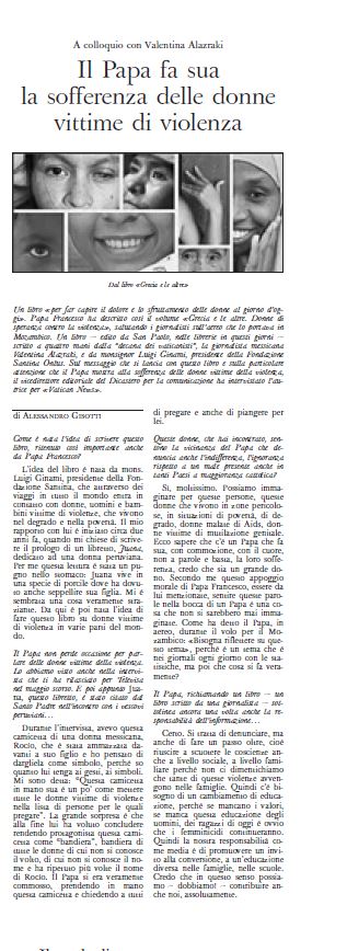 In data 4 settembre 2019 Papa Francesco ha voluto parlare del libro salutando i giornalisti a bordo dell’aereo che Lo portava in Mozambico. Sulle pagine de L’OSSERVATORE ROMANO E NEL PORTALE DI VATICAN NEWS il Dottor Alessandro Gisotti ci fa un grande regalo intervistando VALENTINA ALAZRAKI. Ecco a voi il link cliccando sulle immagini qui sotto riportate: