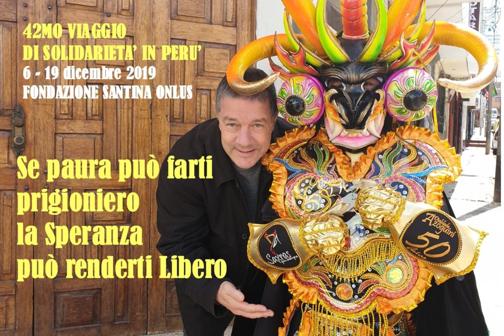 Sta per iniziare un nuovo viaggio di solidarietà. Siamo arrivati al quarantaduesimo viaggio che la solidarietà firmata Fondazione Santina realizzerà. Questo è ultimo progetto inaugurato nell’anno 2019, dopo un’aula scolastica ed una cella in un carcere del Kenya, dopo un acquedotto e una nuova strada nella giungla del Vietnam del nord, dopo un pozzo di acqua in un villaggio in Iraq nei pressi di Mosul, dopo un refettorio per carcerati con problemi psichiatrici e un piccolo asilo per figli di detenute a Las Cruces in Messico per giungere nel mese di novembre ad un nuovo dormitorio in una struttura per tossicodipendenti. Tanti piccoli grandi miracoli che nel nome di Santina abbiamo realizzato. Potete qui sopra vedere un promo con fantastiche immagini del Perù sulle note della canzone della Pausini GENTE. Accompagnateci con la vostra preghiera e la vostra amicizia. Il viaggio è impegnativo ed è guidato da uno slogan molto bello: “Se paura può renderti prigioniero, la Speranza può renderti Libero. Eccovi il programma