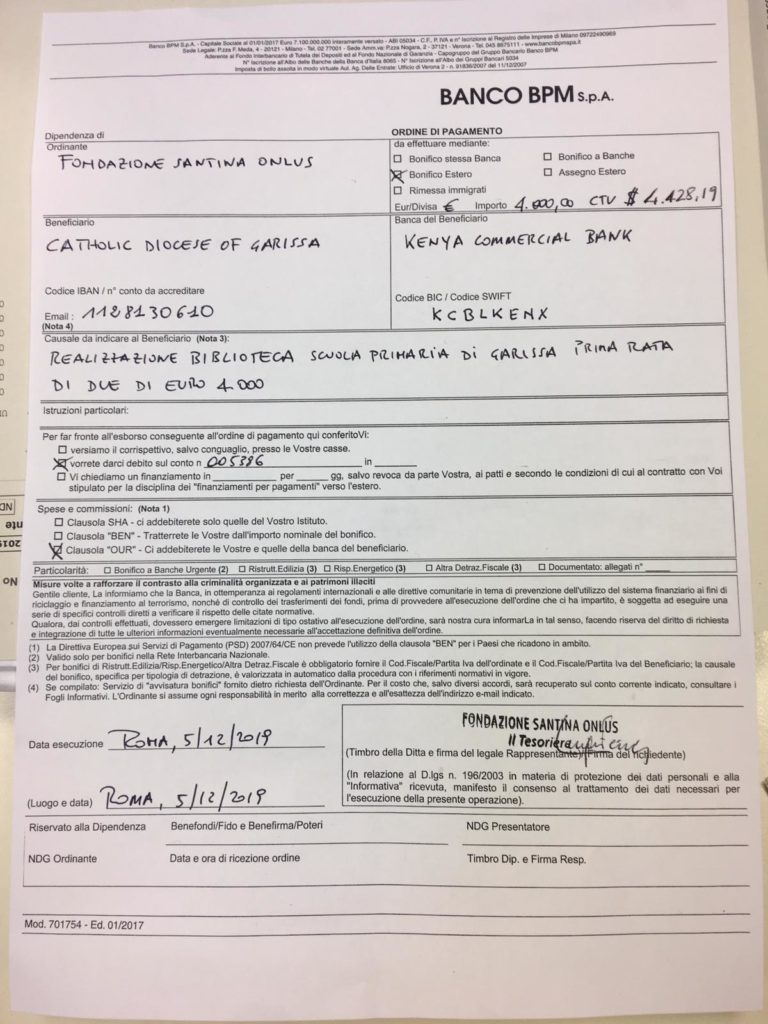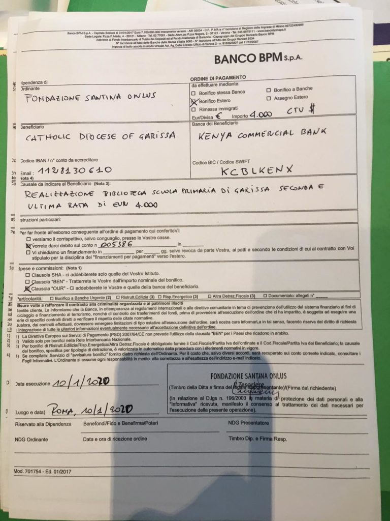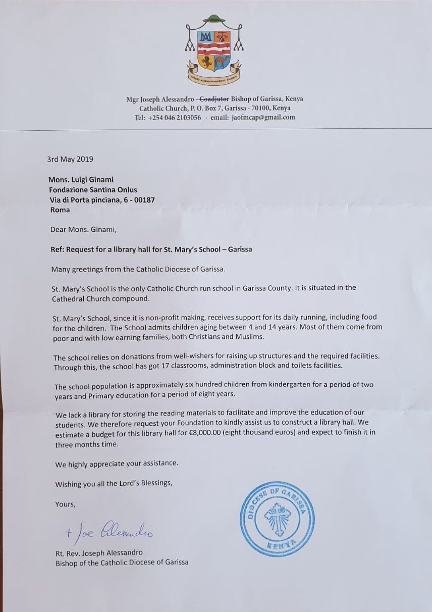 on the occasion of the recent Solidarity Journey of our Fondazione Santina ONLUS – which took place from 27th of April to 6th of May 2019 – following your request of 3th of May 2019, I formulated to our Board of Directors the application of Euro 8,000 to be able to create a a library hall for St. Mary’s School – Garissa. I am pleased to announce that on 11th of November 2019 the Board of Directors, meeting at the Rome office of our Foundation, unanimously decided to allocate the entire amount requested by you for a total of Euro 8000. After having made this important point here are the conditions of our agreement: