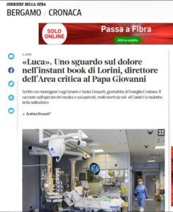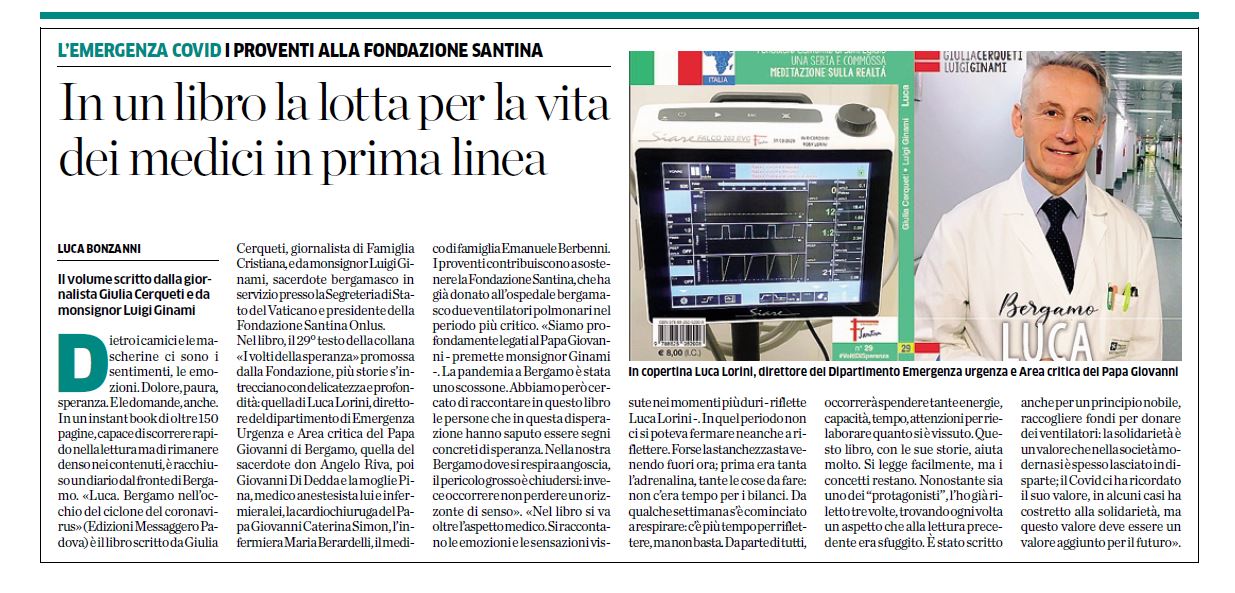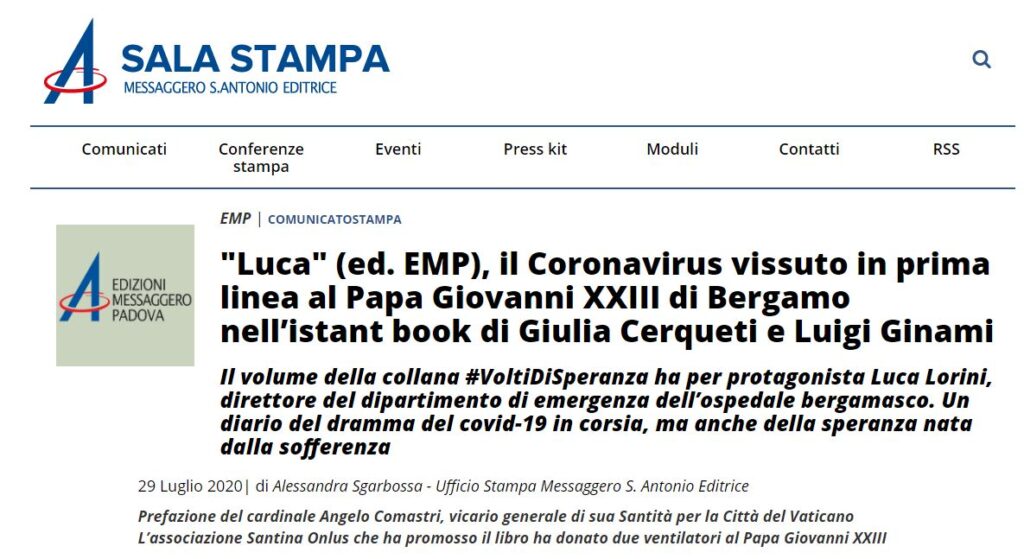 “Luca” (ed. EMP), il Coronavirus vissuto in prima linea al Papa Giovanni XXIII di Bergamo nell’istant book di Giulia Cerqueti e Luigi Ginami.Il volume della collana #VoltiDiSperanza ha per protagonista Luca Lorini, direttore del dipartimento di emergenza dell’ospedale bergamasco. Un diario del dramma del covid-19 in corsia, ma anche della speranza nata dalla sofferenza. Prefazione del cardinale Angelo Comastri, vicario generale di sua Santità per la Città del Vaticano L’associazione Santina Onlus che ha promosso il libro ha donato due ventilatori al Papa Giovanni XXIII