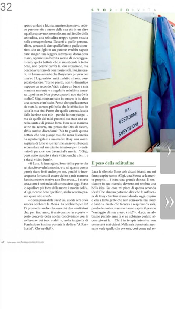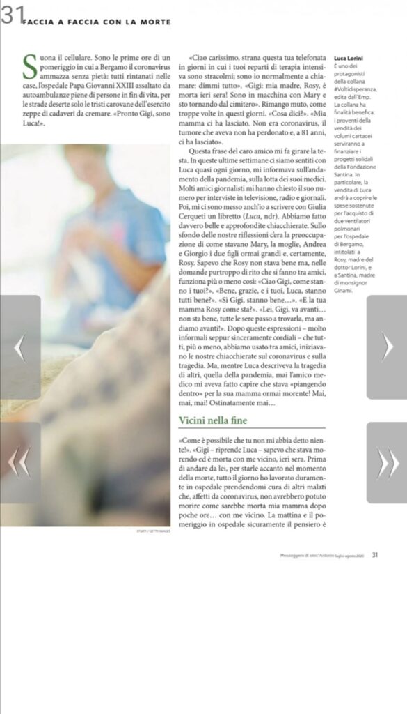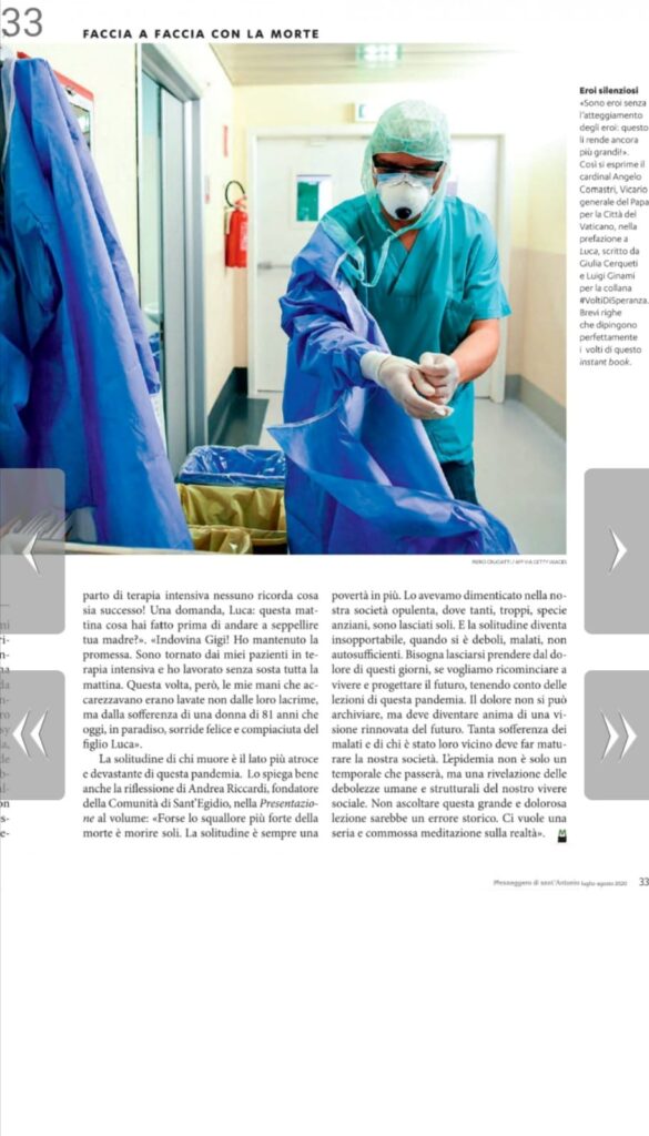 «Sì Luca, lo immagino. Sono felice per te che sei riuscito a vederla morire, e tu sai quanto queste parole siano forti anche per me, perché io invece questa fortuna di essere vicino a mia mamma Santina mentre moriva non l’ho avuta… è morta sola, come i tuoi malati di coronavirus oggi. Forse lo squallore più forte della morte è morire soli!». «Gigi, ricordo bene quel fatto, anche se sono passati quasi otto anni!». «Io cosa posso dirti Luca? Sai, questa sera devo ancora celebrare la Messa. La celebrerò per lei! Ti prometto anche che uno dei due ventilatori che, per fine mese, ti arriveranno in reparto – gesto concreto della nostra condivisione con le sofferenze dei tuoi malati –, nella targhetta di Fondazione Santina porterà la dedica: “A Rosy Lorini”. Che ne dici?». Luca fa silenzio. Sono solo alcuni istanti, ma mi fanno capire tanto: «Gigi, una Messa se la merita proprio… è stata una grande donna! Il ventilatore in suo ricordo, davvero, mi sembra una bella idea. Sai cosa mi piace di questa seconda idea? Che almeno potremo dire che le sofferenze di Rosy e Santina stanno dando, oggi, respiro e vita a tanta gente che non conoscerà mai Rosy e Santina. Gente che tornerà a respirare da sola, perché le nostre mamme hanno capito il grande “vantaggio di non essere viste!”». «Luca, ne abbiamo parlato anni fa e ne abbiamo parlato alcuni giorni fa… Chi è in terapia intensiva non conoscerà mai chi sei. Nella sala operatoria, nessuno vede quello che avviene, così come nel re- parto di terapia intensiva nessuno ricorda cosa sia successo! Una domanda, Luca: questa mattina cosa hai fatto prima di andare a seppellire tua madre?». «Indovina Gigi! Ho mantenuto la promessa. Sono tornato dai miei pazienti in terapia intensiva e ho lavorato senza sosta tutta la mattina. Questa volta, però, le mie mani che accarezzavano erano lavate non dalle loro lacrime, ma dalla sofferenza di una donna di 81 anni che oggi, in paradiso, sorride felice e compiaciuta del figlio Luca». La solitudine di chi muore è il lato più atroce e devastante di questa pandemia. Lo spiega bene anche la riflessione di Andrea Riccardi, fondatore della Comunità di Sant’Egidio, nella Presentazione al volume: «Forse lo squallore più forte della morte è morire soli. La solitudine è sempre una povertà in più. Lo avevamo dimenticato nella nostra società opulenta, dove tanti, troppi, specie anziani, sono lasciati soli. E la solitudine diventa insopportabile, quando si è deboli, malati, non autosufficienti. Bisogna lasciarsi prendere dal dolore di questi giorni, se vogliamo ricominciare a vivere e progettare il futuro, tenendo conto delle lezioni di questa pandemia. Il dolore non si può archiviare, ma deve diventare anima di una visione rinnovata del futuro. Tanta sofferenza dei malati e di chi è stato loro vicino deve far maturare la nostra società. L’epidemia non è solo un temporale che passerà, ma una rivelazione delle debolezze umane e strutturali del nostro vivere sociale. Non ascoltare questa grande e dolorosa lezione sarebbe un errore storico. Ci vuole una seria e commossa meditazione sulla realtà».