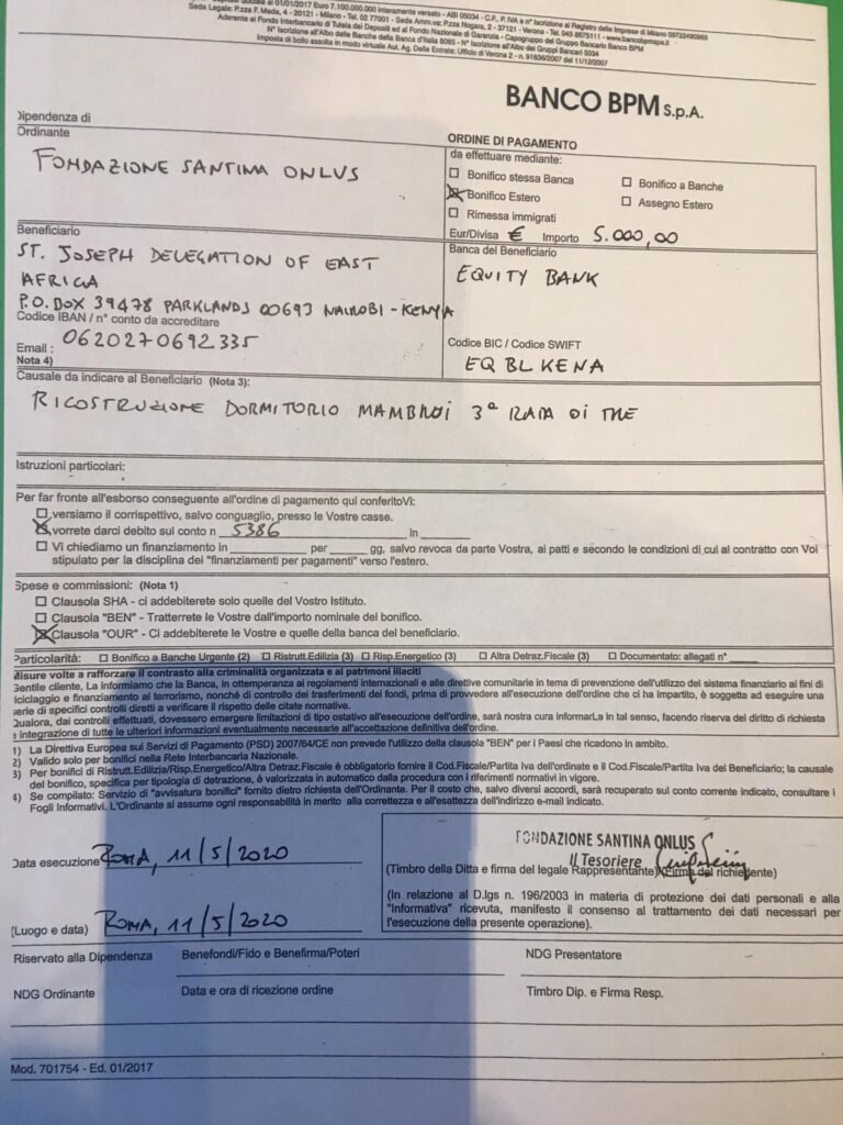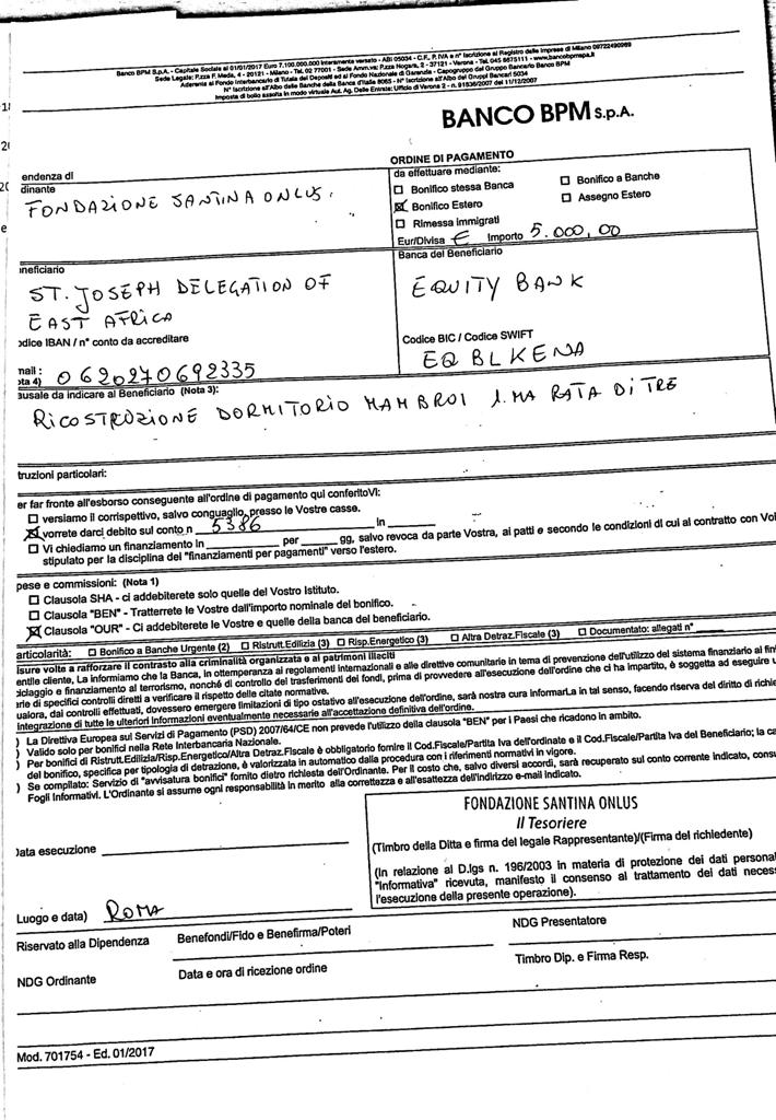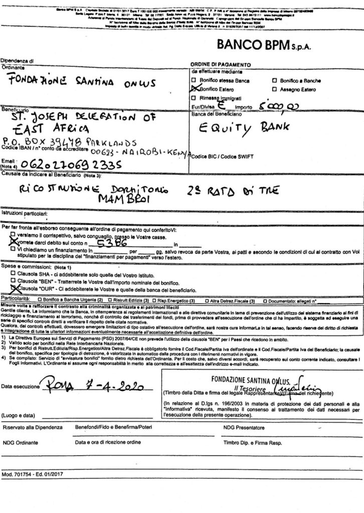 in seguito alla richiesta del 14 Febbraio 2020 pervenuta alla Fondazione e riguardante il progetto per la ricostruzione di un dormitorio nell’orfanotrofio di Mabrui chiamato Asante Sana Children’s Home Mambrui-Lamo Road, Kenya per l’importo complessivo di euro di 15.000 Euro, siamo lieti di annunciare che in data 5 marzo 2020 il Consiglio di Amministrazione della Fondazione Santina Onlus all’unanimità ha deciso di approvare il progetto e stanziare l’intera somma richiesta. Siamo felici della valenza simbolica dell’approvazione in una data tanto suggestiva per noi, perché il 5 marzo del 2015 nasceva Fondazione Santina ONLUS e, dopo un quinquennio, tale progetto è per noi tanto bello quanto significativo e ci spinge a dire che, se i lavori saranno realizzati con cura, chiarezza e puntualità, vorremmo in futuro continuare a starvi vicino con altri interventi a favore dei bimbi orfani e affetti da HIV. Ci sprona a queste considerazioni anche l’accoglienza che avete dato ai tre piccoli orfani SANTINA, RAMSI E NORA, che tanto hanno sofferto, ed in particolare, siamo lieti per la piccola Santina a cui la mamma Everlyne aveva dato nome di Santina proprio in onore di Santina Zucchinelli.