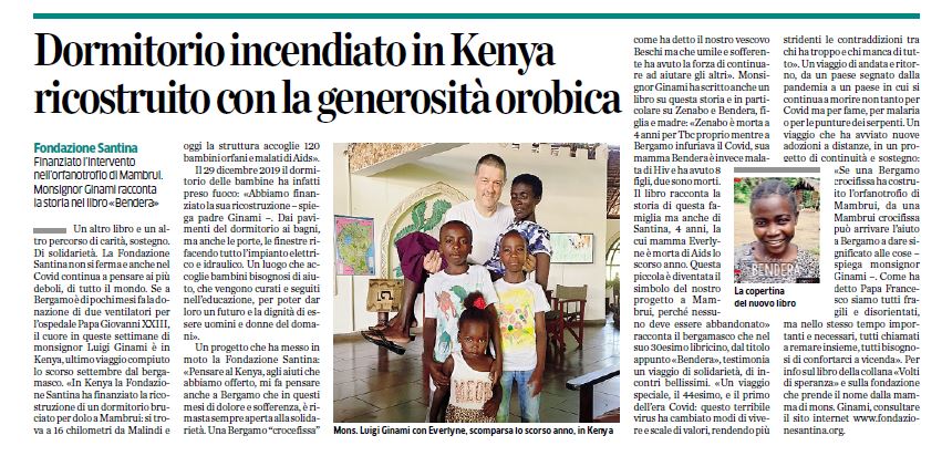 Un altro libro e un altro percorso di carità, sostegno. Di solidarietà. La Fondazione Santina non si ferma e anche nel Covid continua a pensare ai più deboli, di tutto il mondo. Se a Bergamo è di pochi mesi fa la donazione di due ventilatori per l’ospedale Papa Giovanni XXIII, il cuore in queste settimane di monsignor Luigi Ginami è in Kenya, ultimo viaggio compiuto lo scorso settembre dal bergamasco. «In Kenya la Fondazione Santina ha finanziato la ricostruzione di un dormitorio bruciato per dolo a Mambrui: si trova a 16 chilometri da Malindi e oggi la struttura accoglie 120 bambini orfani e malati di Aids».