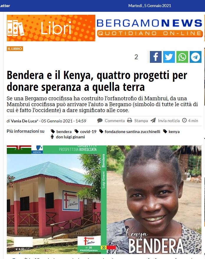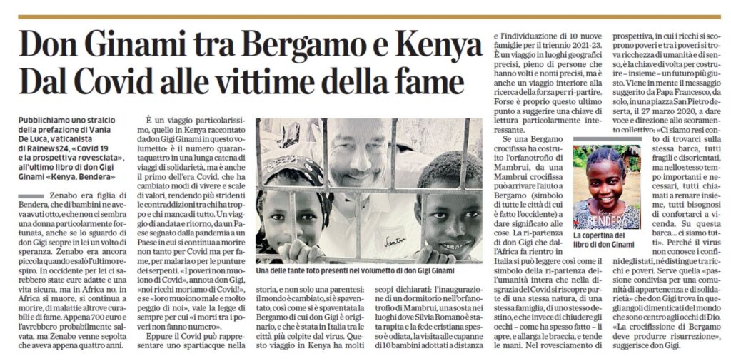 Una Bergamo crocefissa come ha detto il nostro vescovo Beschi ma che umile e sofferente ha avuto la forza di continuare ad aiutare gli altri». Monsignor Ginami ha scritto anche un libro su questa storia e in particolare su Zenabo e Bendera, figlia e madre: «Zenabo è morta a 4 anni per Tbc proprio mentre a Bergamo infuriava il Covid, sua mamma Bendera è invece malata di Hiv e ha avuto 8 figli, due sono morti. Il libro racconta la storia di questa famiglia ma anche di Santina, 4 anni, la cui mamma Everlyne è morta di Aids lo scorso anno. Questa piccola è diventata il simbolo del nostro progetto a Mambrui, perché nessuno deve essere abbandonato» racconta il bergamasco che nel suo 30esimo libricino, dal titolo appunto «Bendera», testimonia un viaggio di solidarietà, di incontri bellissimi.