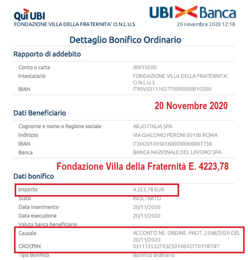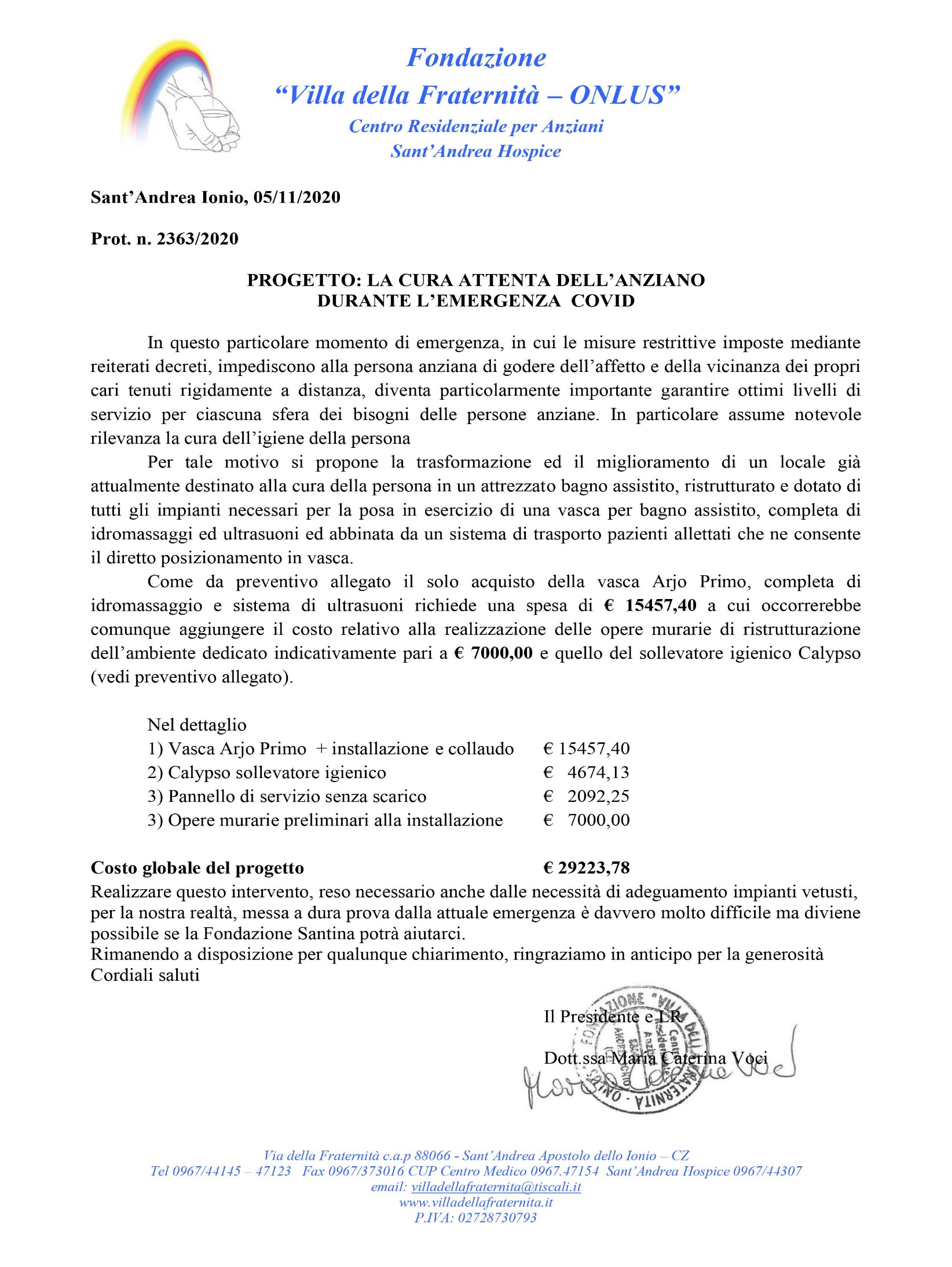 Sono rimasto particolarmente colpito dalla sua lettera del 5 novembre 2020 (Prot. n. 2363/2020) nella quale si illustrava con accuratezza le necessità del Centro Residenziale per Anziani di Villa della Fraternità ONLUS nella grave emergenza della Pandemia COVID19 che ha reso la Calabria zona rossa. Nella sua lettera tutti noi del Consiglio di Amministrazione abbiamo rivissuto i drammatici momenti trascorsi in modo devastante dalla Città di Bergamo che abbiamo recentemente aiutato con l’acquisto di due ventilatori polmonari per la terapia intensiva dell’Ospedale Papa Giovanni XXIII. Anche per equità, ora che la Calabria sta vivendo momenti drammatici non potevamo rimanere insensibili alla richiesta contenuta nella sua missiva. Nella lettera lei chiedeva un aiuto per realizzare: “la trasformazione ed il miglioramento di un locale già attualmente destinato alla cura della persona in un attrezzato bagno assistito, ristrutturato e dotato di tutti gli impianti necessari per la posa in esercizio di una vasca per bagno assistito, completa di idromassaggi ed ultrasuoni ed abbinata ad un sistema di trasporto pazienti allettati che ne consente il diretto posizionamento in vasca” per un totale complessivo di EURO 29.223, 78. Sono lieto di annunciare che in data 6 novembre 2020 il Consiglio di Amministrazione, riunito alle ore 21,00 in videoconferenza, all’unanimità ha deciso di stanziare a favore della lodevole iniziativa in Calabria zona rossa per Pandemia COVID19 la somma di Euro 18.000 Dopo aver fatto questa importante premessa ecco le condizioni del nostro accordo legate al preventivo ARJ-01848-2020 a voi fornito nel dettaglio dalla ditta ARJO per un totale di acquisto di euro 22.223,78 inerente la Vasca Primo, il sollevatore igienico Calypso Pur e spese di istallazione e collaudo.