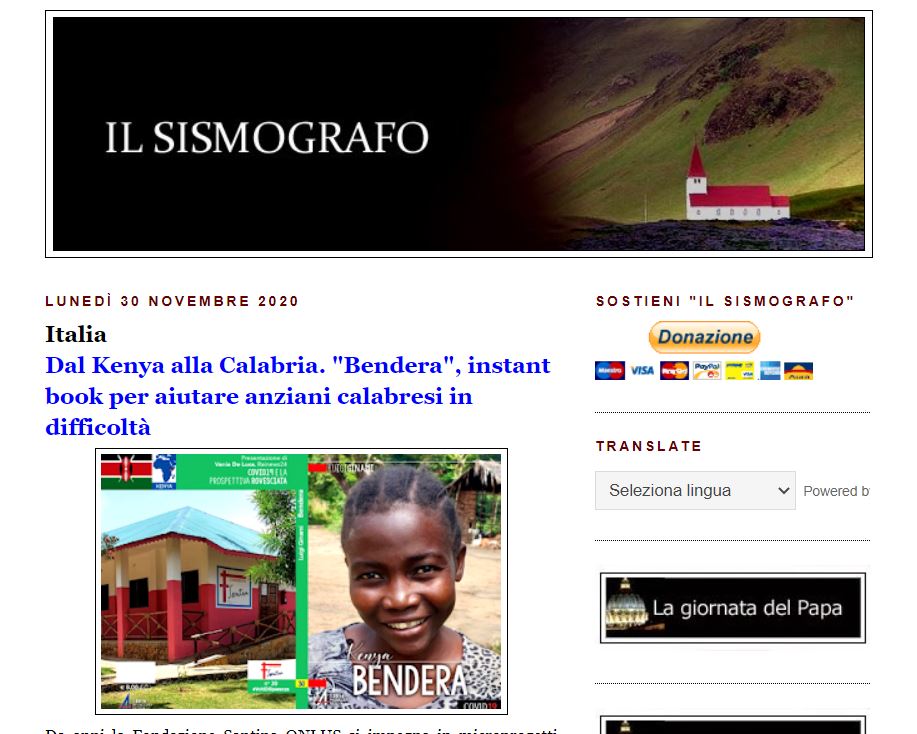 Da anni la Fondazione Santina ONLUS si impegna in microprogetti solidali molto concreti nelle periferie del mondo, dal Messico al Vietnam, dal Perù all’ Iraq. Nonostante la pandemia, poco tempo fa mons. Ginami è riuscito a partire per la sua quarantaquattresima missione di solidarietà in Kenya. Da questo viaggio è nato l’instant book Bendera. Il coraggio di ripartire, trentesimo volume della collana da lui fondata e curata “Volti di Speranza” (Edizioni Messaggero Padova) con presentazione di Vania De Luca Rainews24. I ricavati della vendita del libro saranno per la Calabria che vive un difficile momento.