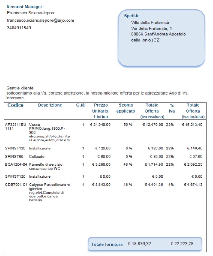 | ACCONTO DITTA ARJO PER BAGNO ASSISTITO a carico di Villa della Fraternità ONLUS |