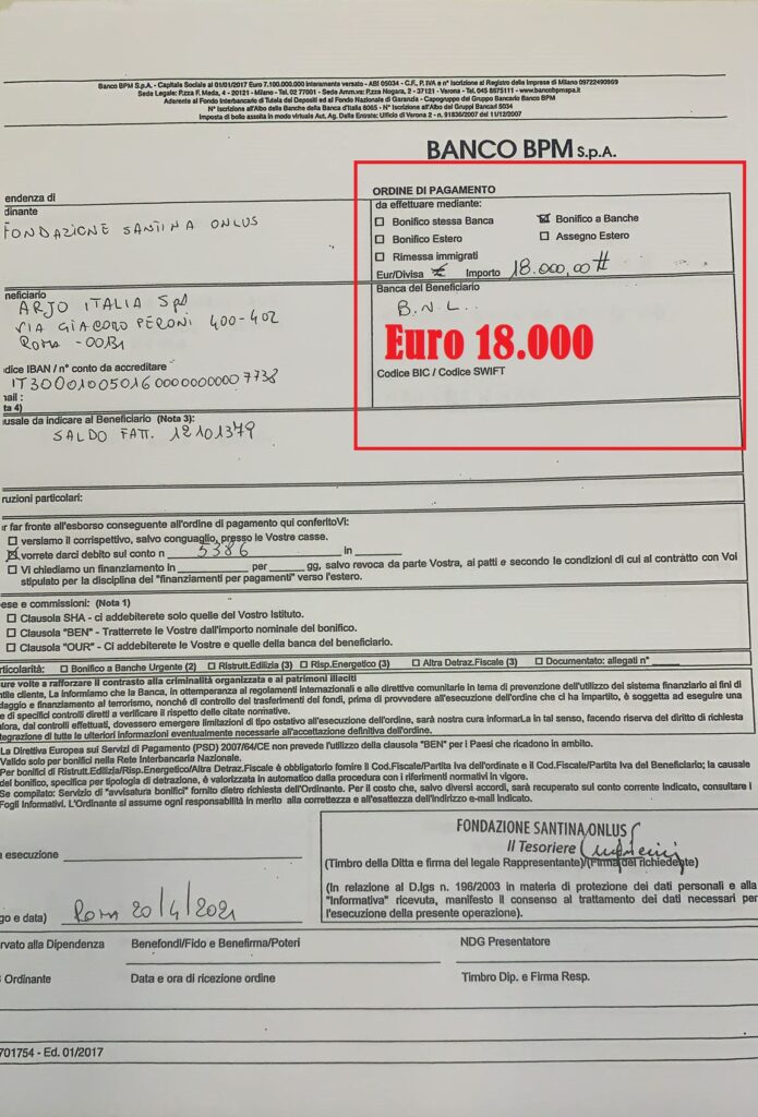 - La somma di Euro 18.000 sarà erogata in unica rata come saldo alla ditta Arjo, previa ricevuta da parte della ditta di avvenuto pagamento della cifra di euro 4.223,78 da voi versata.