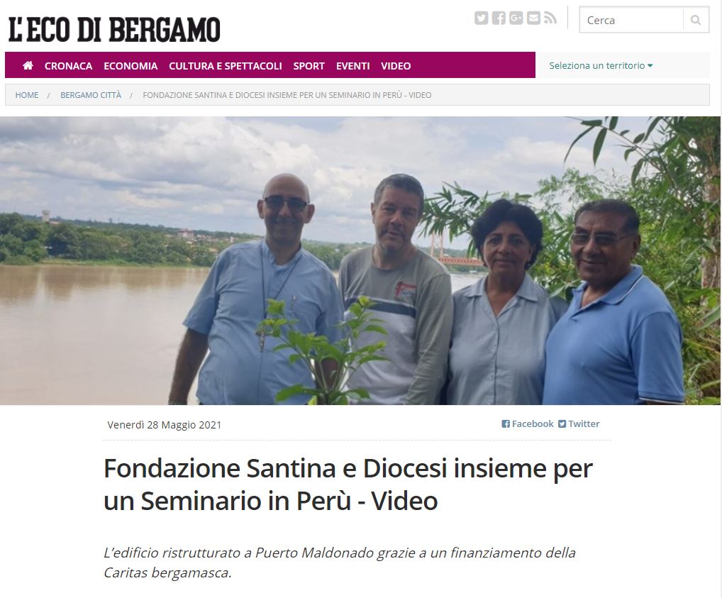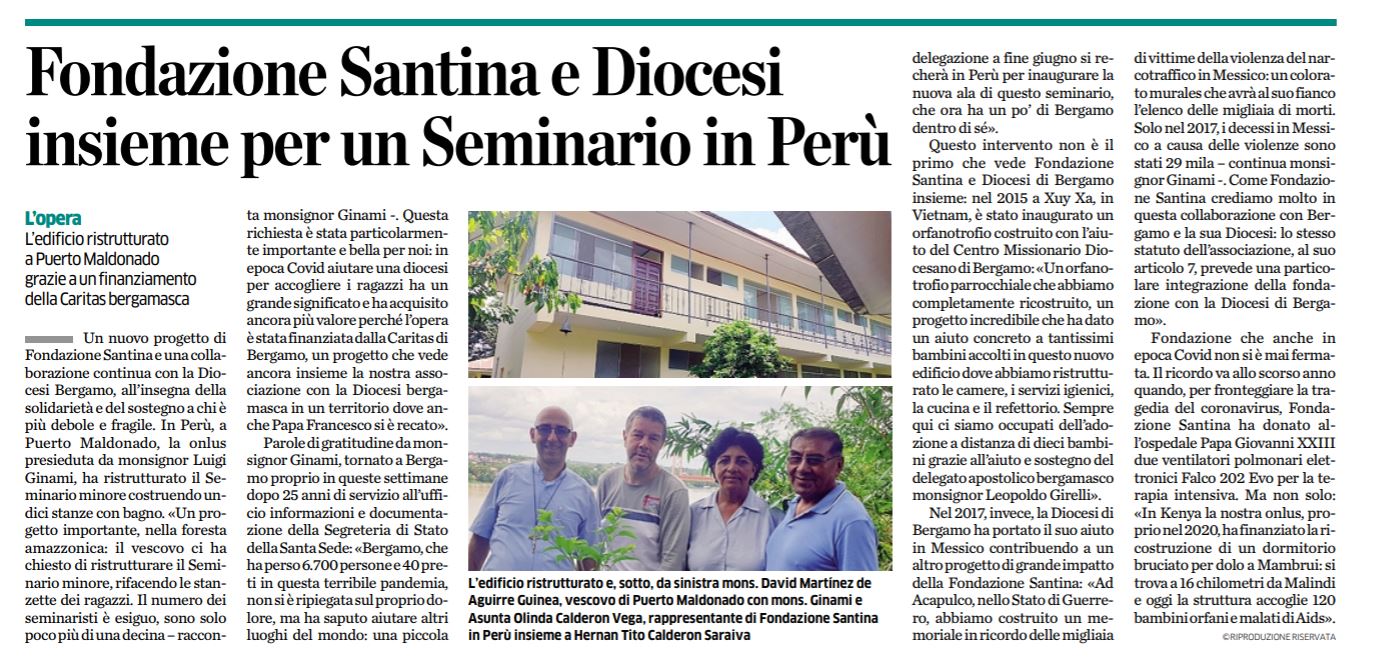I. FONDAZIONE SANTINA E DIOCESI INSIEME PER UN SEMINARIO IN PERU’ (L’ECO DI BERGAMO 28 MAGGIO 2021 PAGINA 24)