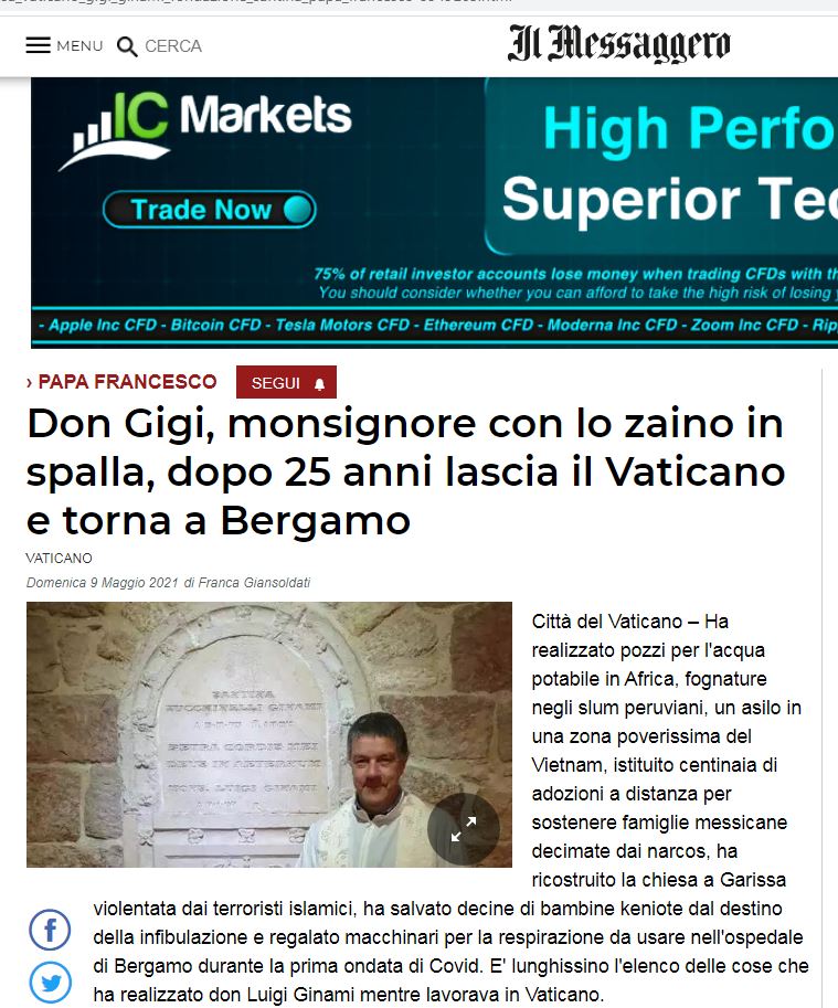 VI. DON GIGI, MONSIGNORE CON LO ZAINO IN SPALLA, DOPO 25 ANNI LASCIA IL VATICANO E TORNA A BERGAMO (DI FRANCA GIANSOLDATI IL MESSAGGERO E IL MATTINO 09.05.2021)