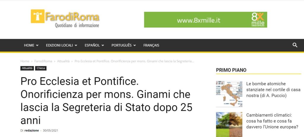 VIII. PRO ECCLESIA ET PONTIFICE. ONORIFICENZA PER MONS. GINAMI CHE LASCIA LA SEGRETERIA DI STATO DOPO 25 ANNI (FARODIROMA 30 MAGGIO 2021)