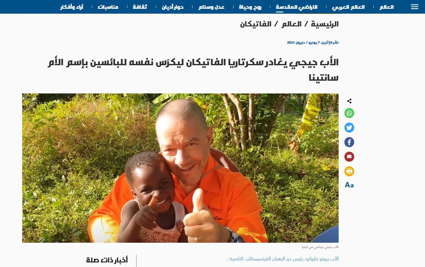 إذا تحدثت عنه الآن لأنه حدث الشيء الذي لم يفاجئني. لعشرة سنوات كان يعود من كل رحلة خيرية، حتى ولو كانت لأبعد الحدود، إلى مكتب سكريتاريا الدولة، يكتب كل ما رآه، وفي بعض الأحيان يرويه مباشرةً للكرادلة وللبابا فرنسيس بذاته. في فترات الإستراحة من عمل الخير كان يواصل عمله في ذلك الوقت بنفس التفاني والإخلاص كما كان من قبل. لكن حياته أصبحت مليئة بأشياء أخرى، ولم تكن جدران ليونينه سوى كبح لإنفجار ذلك الحب الخيري. هكذا حدث كل ما قد تخيلته: إختار الأب جيجي مؤسسته سانتينا والحب للعالم. وبعد ٢٥ عاماً يترك سكرتاريا دولة الفاتيكان، واضعاً نفسه على أهبة الإستعداد من الأول من تموز/ لوليو في أبرشيته في بيرغمو حيث يمكنه بكل حرية متابعة مساعدة بائسيه في العالم الذين ينتظرونه بفارغ الصبر. كما ذكر الأسقف داريو إدواردو فيغانو عندما أعلن عن عودة الأب جيجي إلى وطنه، في بيرغمو ‘ يريد ان يكرّس نفسه بشكل أفضل، بشغف أكبر، لأعمال الرحمة الخيرية وبالأخص لحياة مؤسسة سانتينا ‘ . ليس بمحض الصدفة أن يعود قريباً وبشكل دائم إلى بيرغامو، ويبدأ حياته الرعوية الجديدة برحلة التضامن السادسة والأربعين. كما أريد ان أعلن لكم أن رحلة التضامن هذه ستكون في البيرو نيابةً عن مؤسسة سانتينا، وأيضاً عن الأبرشية، لأن كاريتاس بيرغامو قام بتمويل كامل لترميم جزء من المعهد الإكليريكي في بويرتو مالدونادو في أمازون البيرو ‘ . أتمنى رحلة موفقة إلى الصديق والكاهن الذي إستطاع أن يبهرني كثيراً في السنوات الأخيرة…