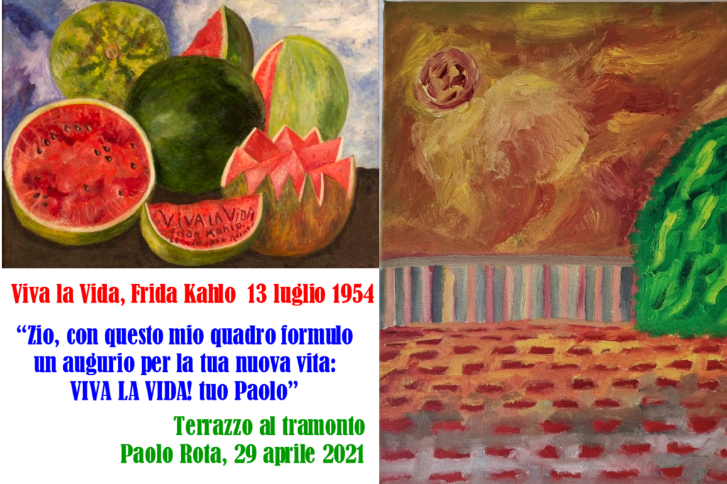 Be il quadro “se la tira un po’” sa di essere una celebrità, ma a me della sua celebrità non me ne frega niente è di Frida che mi interessa. Il quadro, comprensibilmente parla con voce femminile e mi dice “Ciao gigi mi chiamo Viva la Vida! Ma questa notte preferisco che mi chiami di Vida, ok? Non contraddire mai un quadro famoso, prima regola per parlare con i quadri! Vedi sono stata realizzata otto giorni prima della morte di Frida, il 13 luglio del 1954. Lei devi sapere che aveva 47 anni ed abitava a Città del Messico. Io sono il suo ultimo saluto gioioso, di una persona che nella vita ha conosciuto molto presto la malattia e la sofferenza fisica. Ha appena sei anni quando si ammala di poliomielite, guarisce, ma la gamba destra resterà meno sviluppata e rimarrà claudicante. A 18 anni un terribile incidente tra l’autobus e un tram quasi la uccide. Sarà costretta a indossare busti ortopedici e a sottoporsi ad una trentina di interventi chirurgici. La pittura rimarrà per lei l’unica consolazione e valvola di sfogo, ma anche forte dichiarazione di amore per la vita e resistenza e io come quadro rappresento proprio questo”. Il discorso di Vida mi calma il cuore, mi dà pace e lei, il mio quadro continua, ora la sua voce è dolce: “Vedi gigi Frida dipinge essenzialmente autoritratti dolenti, contribuendo al filone autobiografico in arte. Spesso ho sentito Kahlo a dirmi «Ho provato ad affogare i miei dolori, ma hanno imparato a nuotare» e lo ha scritto nei suoi diari anche (Diari “Viva la vida” di Frida Kahlo”). Io sono il quadro che rappresenta un’ultima esplosione di gioia “Viva la vida”. Mentre il quadro mi parla lo guardo: è una natura morta che rappresenta angurie succose, rosse e appetitose. Un grido di colore, il desiderio infinito di gioia di vivere. Ma Vida, il mio quadro, non sta zitto e riprende a parlare: “Io sono un estremo omaggio alla vita. I cocomeri si stagliano verdi e rossi su un cielo azzurro. E guardami sulla polpa succosa e sensuale delle fette è scritto “Viva la Vida – Coyoacán 1954 Mexico”. Le angurie del dipinto vengono rese in tutta la loro fecondità e pienezza, come ricca è stata percepita la vita dall’artista nonostante tutto!”. Cala il silenzio nella mia casa di via Arena 5. I quadri questa notte stanno calmando il mio cuore E’ il quadro di Paolo che torna a parlare, in modo umile davanti al nostro capolavoro e aggiunge: “Vedi gigi Frida ha vissuto intensamente attraversando, anzi, tuffandosi nelle gioie dell’amore e nell’impegno politico. E’ stata una donna emancipata e indipendente, passionale e sanguigna che non pose mai limiti alla sua coraggiosa indole. “Viva la vida” è il suo lascito, il messaggio ultimo per se stessa e per chi ancora vive la vita malgrado tutto merita di essere vissuta caro don gigi. Dunque via ogni paura e timore dal cuore! Apri la finestra e guarda alle tue stelle polari, coraggio, sono le 2 e 30 manca poco all’alba e il tramonto che io rappresento potrebbe in verità essere la tua alba, pensaci gigi!” I due quadri bisbigliano tra di loro qualche parola ed è poi Vida a prendere la parola: “Sentici bene ora vai a dormire, ma qui non abbiamo speso tempo in vano è! Non ti lasciamo dormire finché non prepari un messaggio da mandare ai tuoi amici per whatapp domani appena sveglio. Ok? Coraggio scrivi! I due quadri comandano al cuore prendo una biro blu e sudi una pagina del giornale L’Eco di Bergamo inizio a scrivere lentamente: “Con il cuore pieno di gioia ti annuncio che in data 1 luglio 2021 rientrerò nella mia Diocesi di Bergamo per un bellissimo nuovo incarico e per seguire con ancor più passione Fondazione Santina e l’Associazione! Sono felicissimo e senza il minimo rimpianto per il servizio che termino. Sono riconoscente a Dio per la Carità che ho potuto svolgere durante questi anni ed il mio lungo servizio presso ufficio informazioni e documentazione della Segreteria di Stato”. (4 maggio 2021 ore 2.45). Lo leggo a loro ad alta voce, sono giudici severi, ma sorridono e mi dicono: “Ottimo lavoro, ora puoi proprio dormire!” Mi addormento con il quadro di Paolo attaccato al muro e quello di Frida sull’Ipad. Ed il giorno dopo alle ore 8,45 il messaggio finisce nei cellulari di amici e conoscenti e probabilmente anche sul tuo. Te lo ricordi? Loro due i miei 2 quadri si! Ed ora dopo la mia confessione possiamo continuare.
