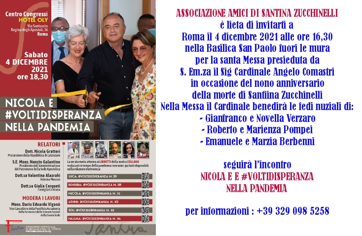 In occasione del nono anniversario della morte di Santina, il prossimo 4 dicembre 2021, la nostra Associazione vivrà la sua festa associativa a Roma. In questa pagina viene presentato il programma che inizierà alle ore 16,30 alla Basilica di San Paolo fuori le Mura con la Santa Messa presieduta dal Cardinale Angelo Comastri e continuerà con un evento importante all’Hotel Oly. Ecco il programma della serata: