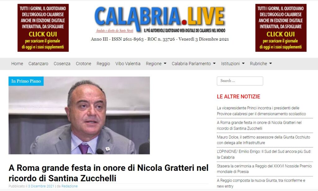 A ROMA GRANDE FESTA IN ONORE DI NICOLA GRATTERI NEL RICORDO DI SANTINA ZUCCHINELLI. DI PINO NANO (CALABRIA.LIVE VENERDI’ 3 DICEMBRE 2021)