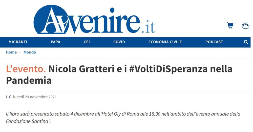 Nicola, Ashur, Bendera, Sol, Luca…. Sono tanti i “volti di speranza” raccontati dalla Fondazione Santina, presieduta da monsignor Luigi Ginami. Piccoli grandi libri che fanno due volte bene. Le loro parole aiutano a guardare oltre le difficoltà. Con il loro acquisto, inoltre, si contribuisce a finanziare progetti di solidarietà nel Sud del mondo come in Italia. Comprando l’ultimo saggio, “Nicola”, dedicato al magistrato Nicola Gratteri, in prima linea contro la ‘ndrangheta, ad esempio, si partecipa alla realizzazione di un bagno attrezzato nella residenza per anziani Villa della Fraternità in Sant’Andrea apostolo dello Ionio, in Calabria. Il libro sarà presentato sabato 4 dicembre all’Hotel Oly di Roma alle 18.30 nell’ambito dell’evento annuale della Fondazione Santina”.