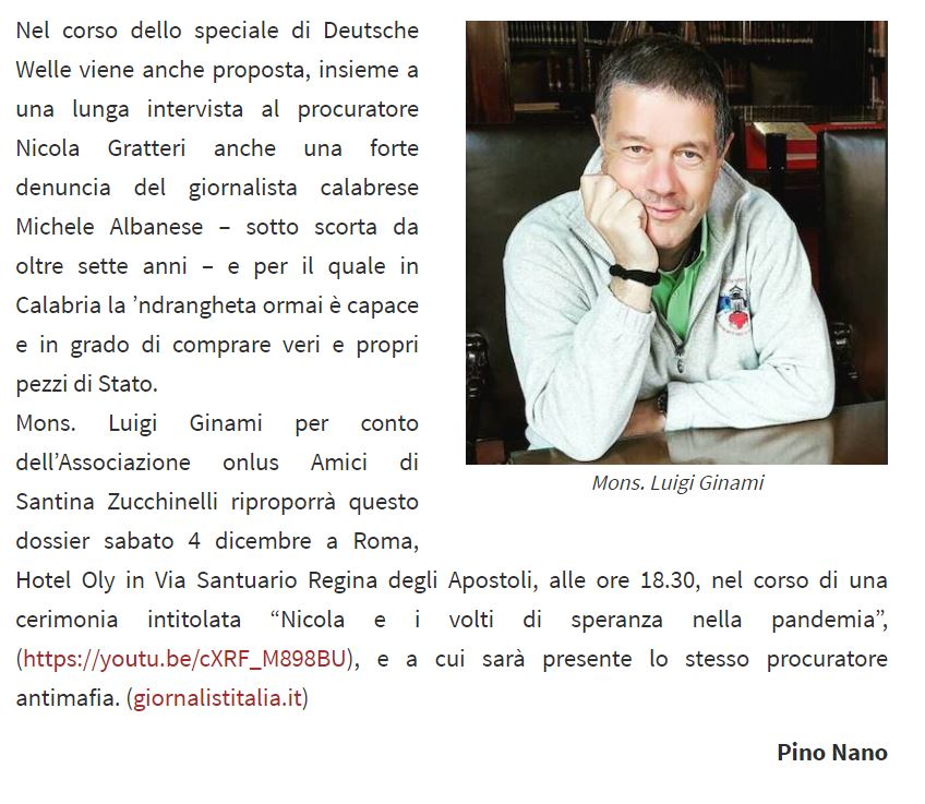 Nel corso dello speciale di Deutsche Welle viene anche proposta, insieme a una lunga intervista al procuratore Nicola Gratteri anche una forte denuncia del giornalista calabrese Michele Albanese – sotto scorta da oltre sette anni – e per il quale in Calabria la ’ndrangheta ormai è capace e in grado di comprare veri e propri pezzi di Stato. Mons. Luigi Ginami per conto dell’Associazione onlus Amici di Santina Zucchinelli riproporrà questo dossier sabato 4 dicembre a Roma, Hotel Oly in Via Santuario Regina degli Apostoli, alle ore 18.30, nel corso di una cerimonia intitolata “Nicola e i volti di speranza nella pandemia”, (https://youtu.be/cXRF_M898BU), e a cui sarà presente lo stesso procuratore antimafia. (giornalistitalia.it)