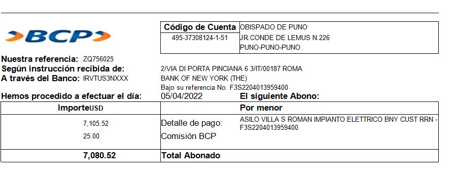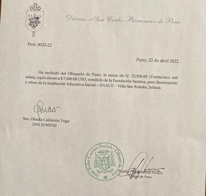 Ringraziamo S.E. Mons. Jorge Pedro Carrión Pavlich Vescovo di Puno, sotto la cui giurisdizione ecclesiastica appartiene Villa San Roman, per la cura con la quale ci ha inviato la ricevuta del denaro sul conto della Diocesi, in data 5 aprile 2022, che qui di seguito riportiamo