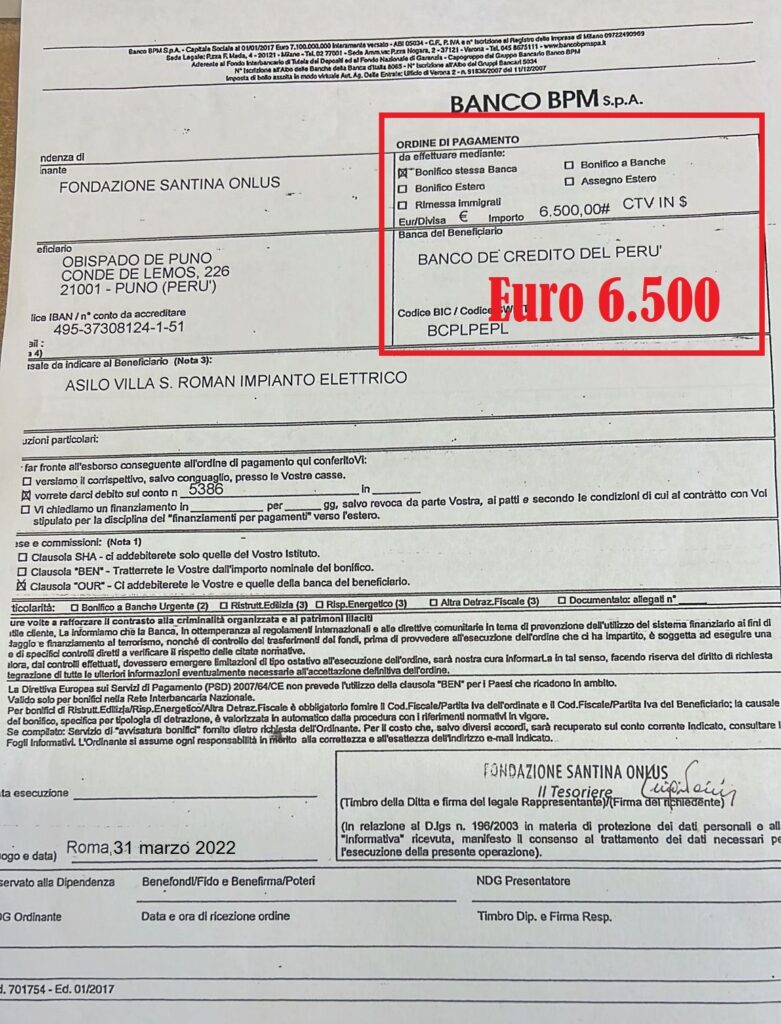 A fronte della firma del protocollo di intesa e del progetto approvato, il nostro tesoriere Dottor Luigi Pacini in data 31 marzo 2022 ha provveduto ad inviare al Vescovo di Puno la somma di denaro come testimonia il documento qui riprodotto.