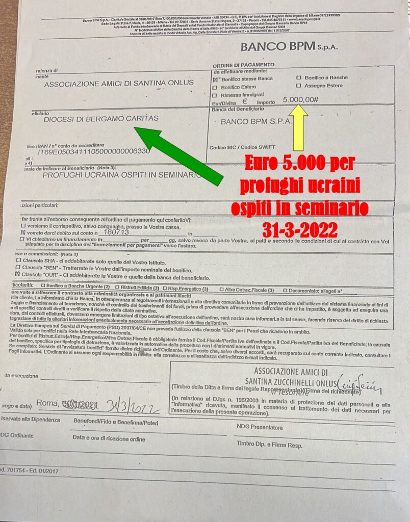 L’Associazione Amici di Santina Zucchinelli risponde alla grande emergenza della guerra in Ucraina ed il 31 marzo 2022 stanzia i primi euro 5.000 a favore dei profughi ucraini ospitati nel Seminario di Bergamo, come spiega l’articolo di Sabrina Penterani qui sotto riportato.