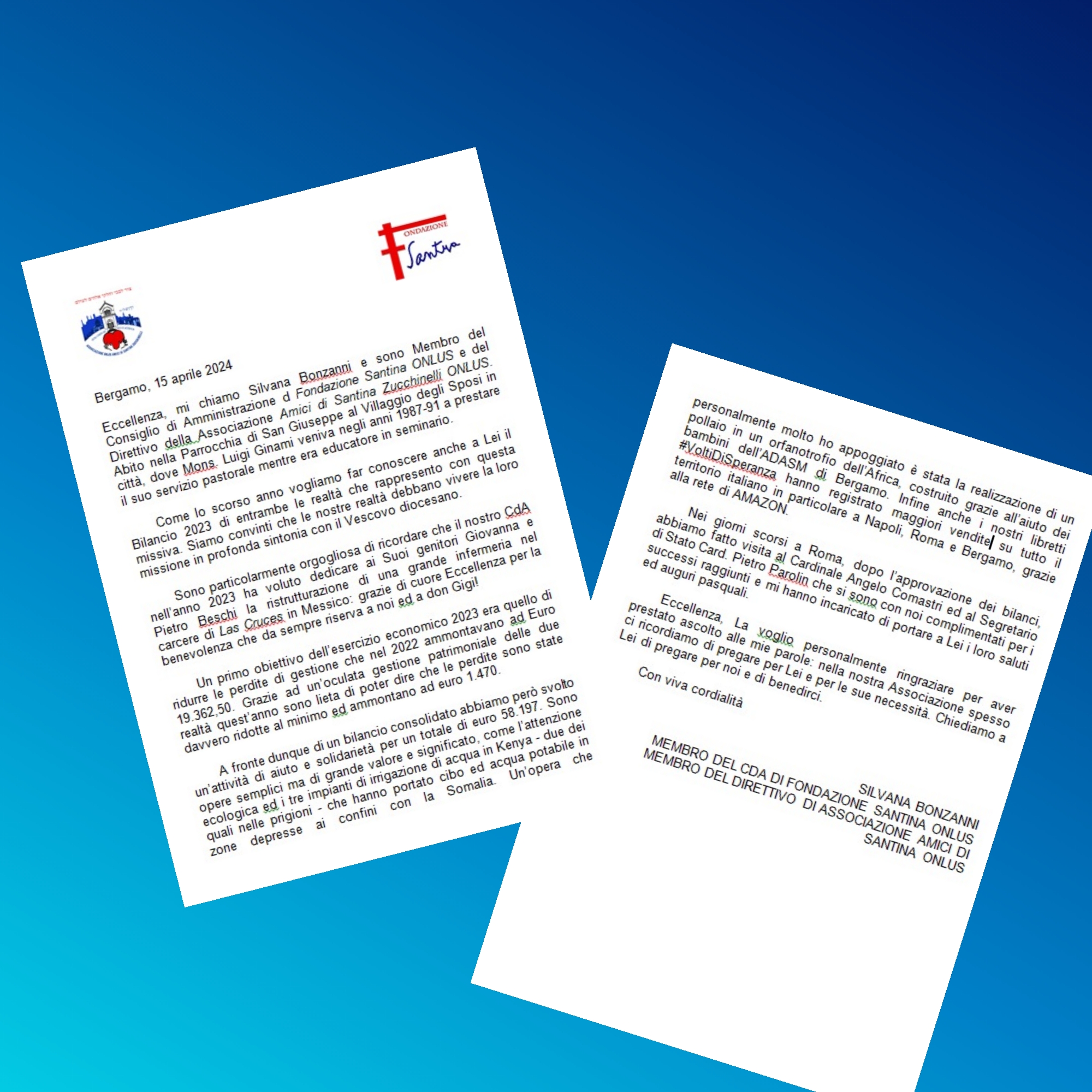 questo mese è stato importante per noi, perché il 12 aprile presso lo Studio Pacini, abbiamo provveduto all’approvazione del bilancio sia di Associazione Amici di Santina Zucchinelli, che di Fondazione Santina.  Con grande soddisfazione vi comunichiamo che le opere da noi realizzate nel 2023, non hanno intaccato il capitale della nostra Fondazione e con l’aiuto della Divina Provvidenza, siamo riusciti a venire incontro alle necessità di tante persone che avevano bisogno del nostro sostegno e della nostra vicinanza. Ciò dimostra che siamo sulla buona strada e che nulla è impossibile a Dio, se crediamo in Lui e nel suo aiuto. Naturalmente abbiamo provveduto ad inviare entrambi i bilanci al Vescovo di Bergamo, accompagnandoli con una lettera, questa: