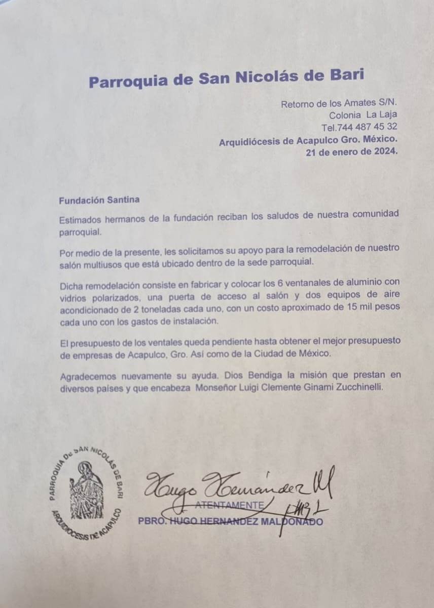 Ecco la lettera del 21 gennaio con la quale il Parroco Padre Hugo chiede il nostro aiuto nella ricostruzione dei locali della parrocchia distrutti dall’uragano Otis il 24 ottobre 2023