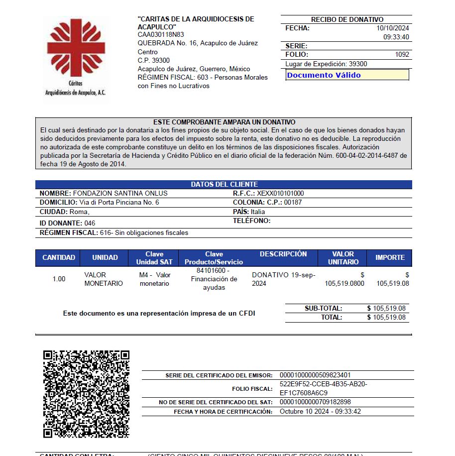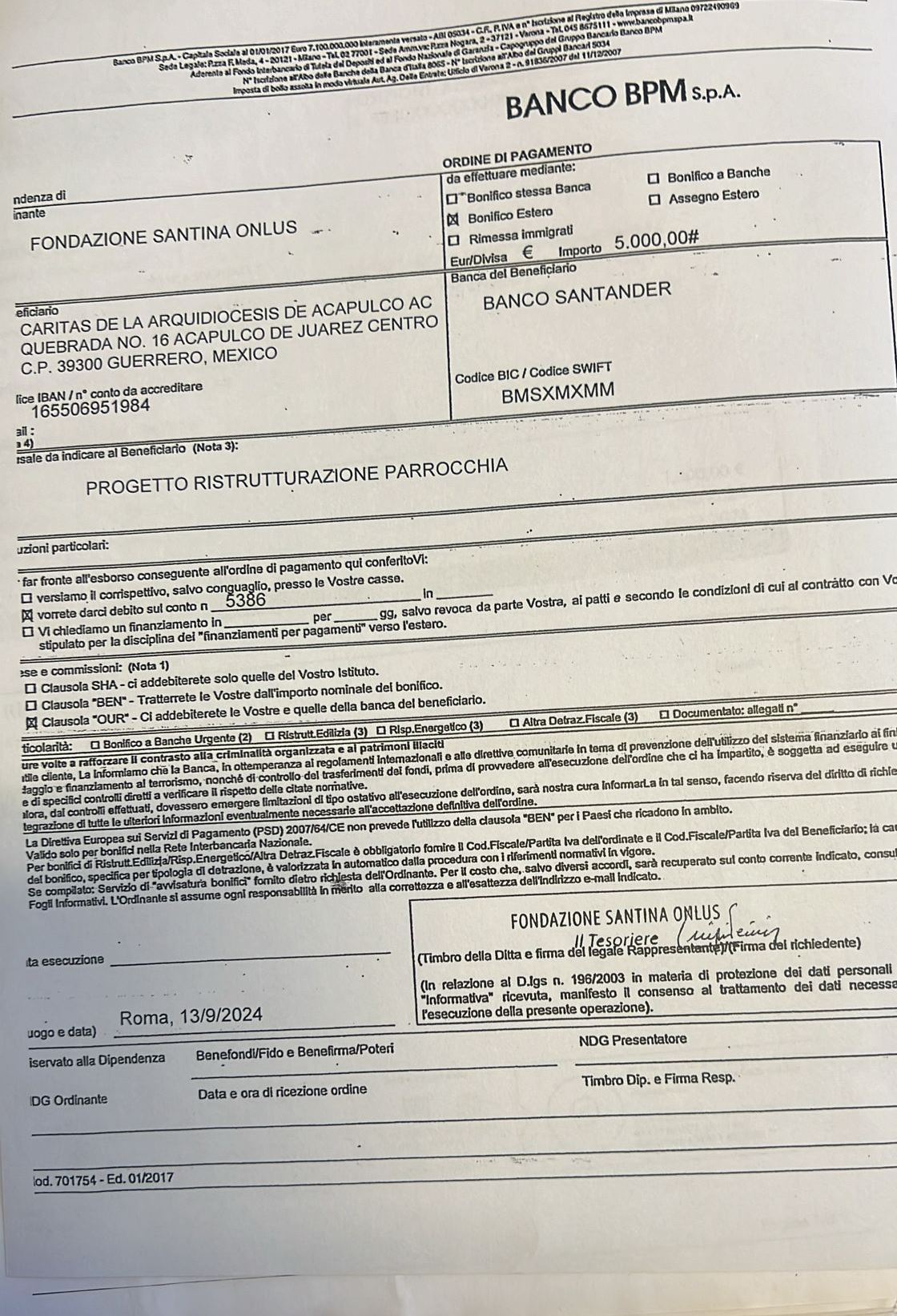 In data 10 ottobre ecco la ricevuta del denaro trasmesso alla Caritas di Acapulco