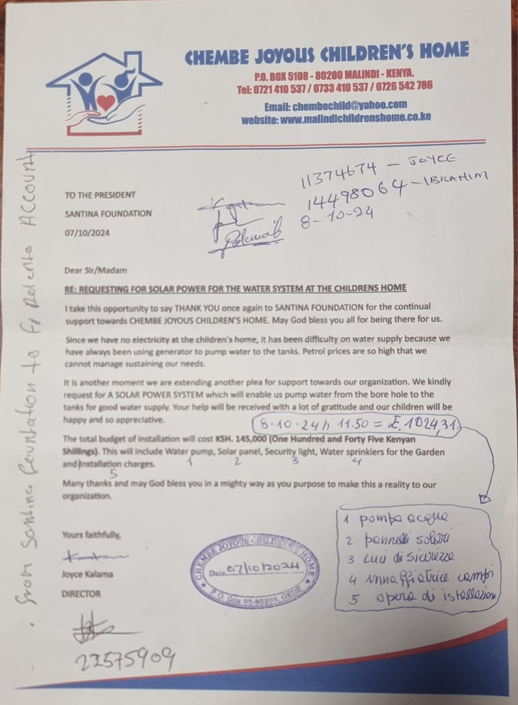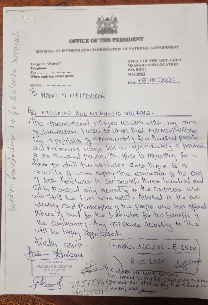 Nel 63mo viaggio di solidarietà in Kenya dal 26 settembre al 10 ottobre, la direttrice dell’orfanotrofio Chembe Joyous Children’s Houe e la responsabile del villaggio di Msabaha ci hanno chiesto di costruire tre pozzi: uno per l’orfanotrofio e due per il villaggio, ecco le due lettere di richiesta