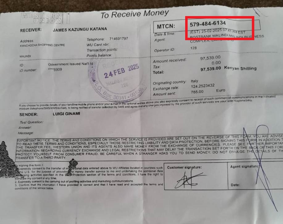 Dopo questo primo invio per pagare le spese della manodopera è stato inviato a Jimmy Katana il totale di euro 785, ecco la ricevuta di Western Union in data 24 febbraio 2025