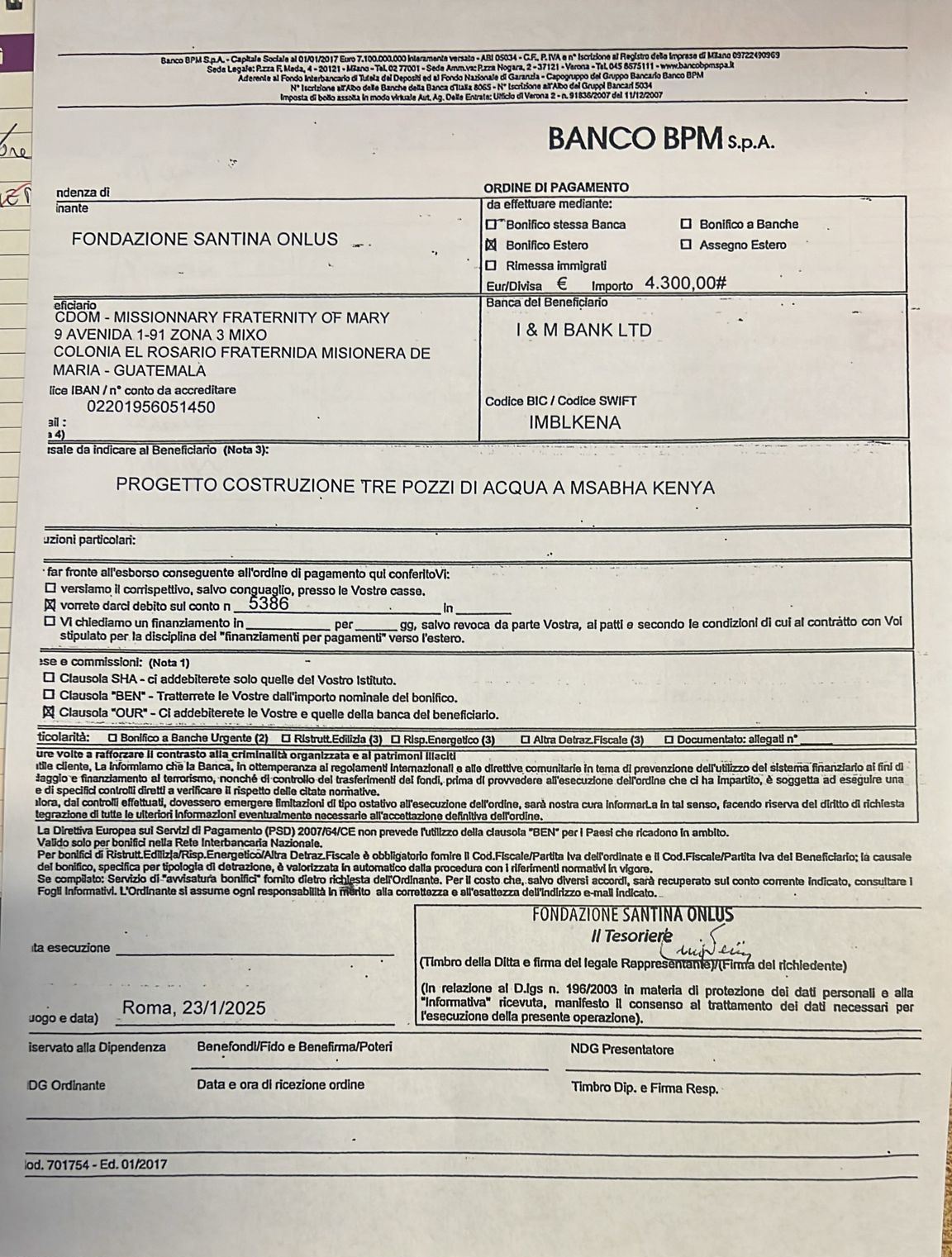In data 23 gennaio 2025 il nostro tesoriere provvedeva ad inviare alla Fraternità Missionaria di Maria Euro 4.300 come spese per la costruzione dei pozzi. Jimmy Katana ha provveduto all’acquisto del materiale