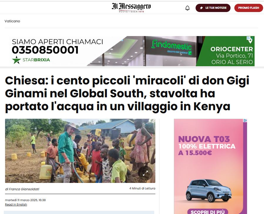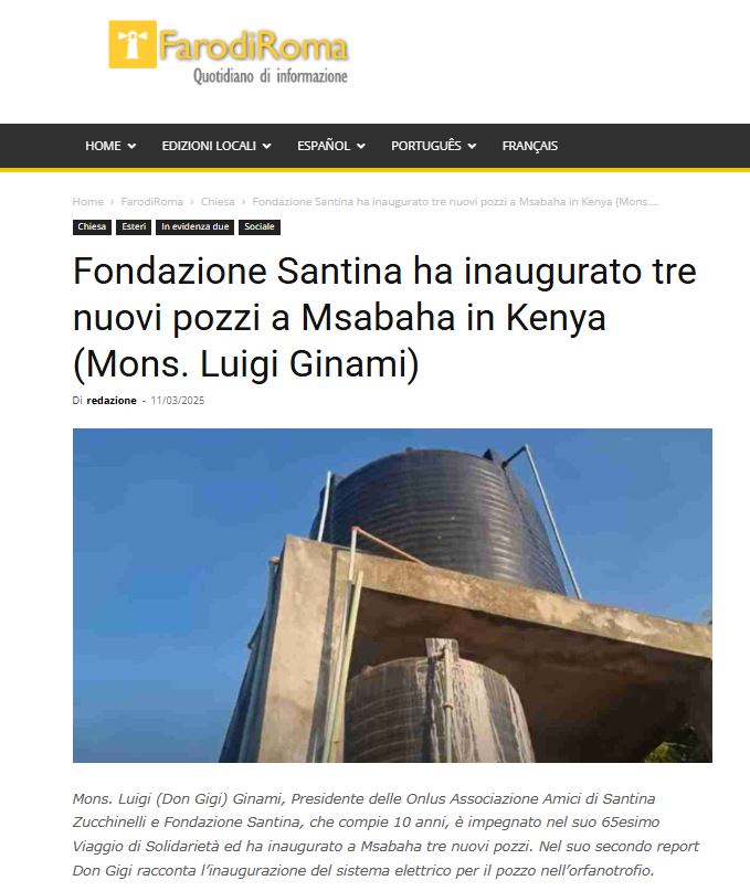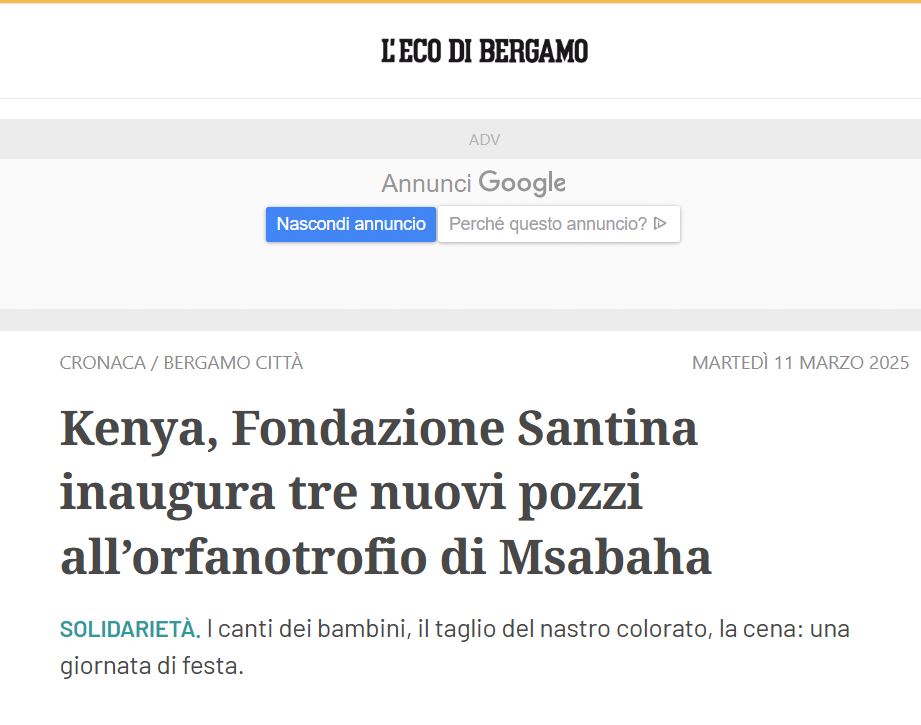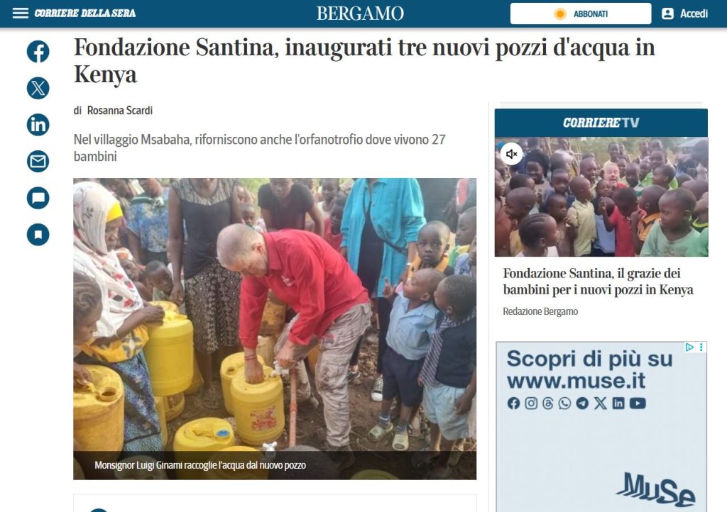KENYA, FONDAZIONE SANTINA INAUGURA TRE NUOVI POZZI ALL’ORFANOTROFIO DI MSABAHA (ECODIBERGAMO.IT DELL’11 MARZO 2025)