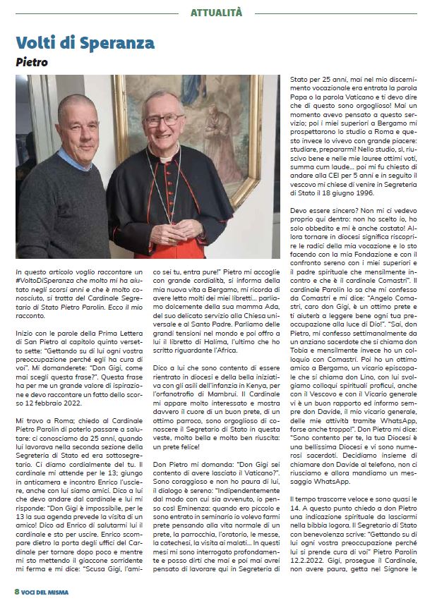 Pietro mi accoglie con grande cordialità, si informa della mia nuova vita a Bergamo, mi ricorda di avere letto molti dei miei libretti. Parliamo dolcemente della sua mamma Ada, del suo delicato servizio alla Chiesa universale e al Santo Padre. Parliamo delle grandi tensioni nel mondo e poi offro a lui il libretto di Halima, l’ultimo che ho scritto riguardante l’Africa. Gli dico che sono contento di essere rientrato in diocesi e della bella iniziativa con gli asili dell’infanzia in Kenya, per l’orfanotrofio di Mambrui. Il Cardinale mi appare molto interessato e mostra davvero il cuore di un buon prete, di un ottimo parroco. Sono orgoglioso di conoscere il Segretario di Stato in questa veste, molto bella e molto ben riuscita: un prete felice.