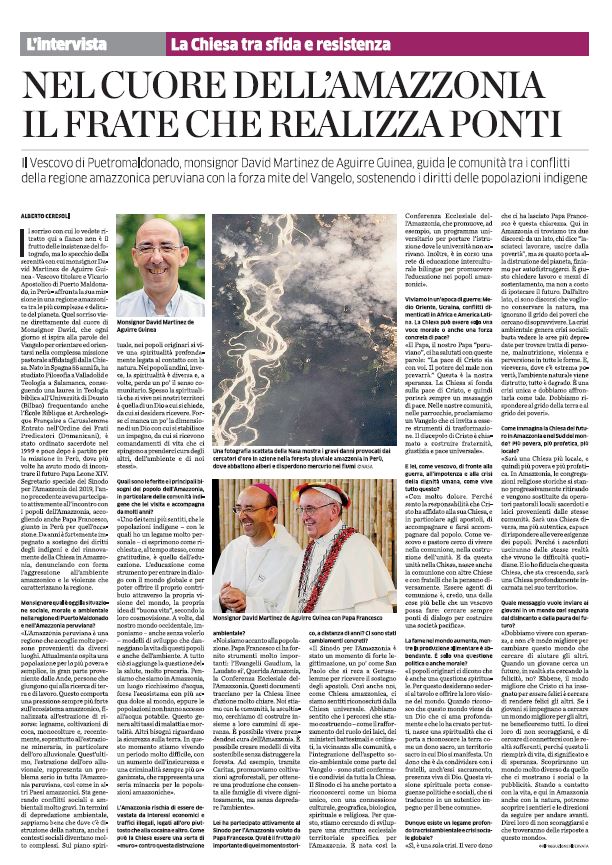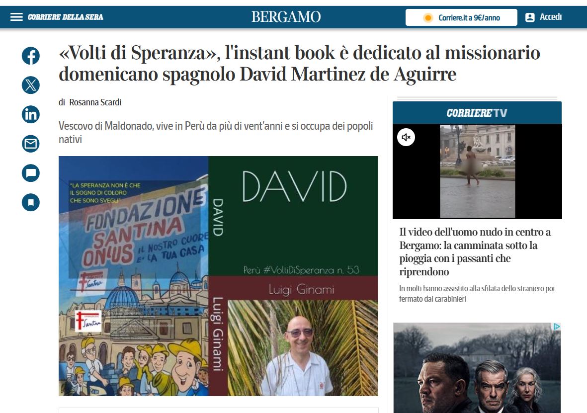 È dedicato a David l’instant book numero 53 della collana «Volti di Speranza» della Fondazione Santina Onlus (in vendita sulla piattaforma Amazon al costo di 5 euro). Si tratta di un missionario domenicano spagnolo, David Martinez de Aguirre, vescovo di Maldonado, che vive in Perù da più di vent’anni occupandosi dei popoli nativi. Il suo è un percorso che ricorda quello di Papa Leone, che conosce molto bene. «Padre David – afferma monsignor Luigi Ginami, presidente della fondazione – si è sempre schierato con i più poveri in un contesto dalla violenza crescente tanto da aver subìto un assalto; e ha a cuore il tema dell’ambiente, tanto da essere stato il grande regista del sinodo Amazzonia nel 2019».