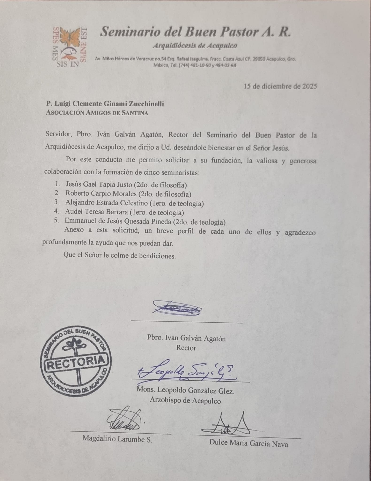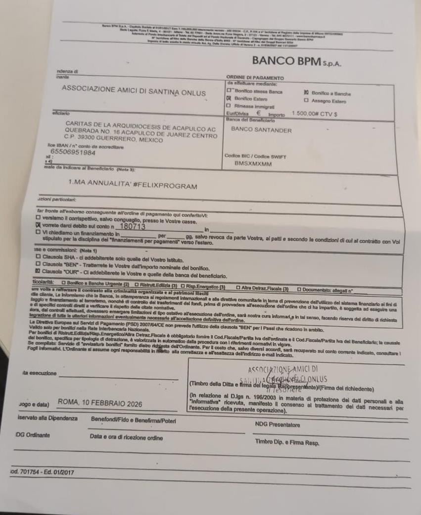 Gli euro 1.500 sono stati interamente erogati alla Caritas di Acapulco, con l’impegno di devolvere al seminario arcidiocesano la somma, che sarà nuovamente erogata nel prossimo mese di dicembre 2026 unitamente con i nove bambini in adozione a distanza. Ecco la prima rata: