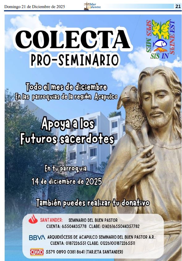 E’ la proposta di adozioni a distanza per tre anni (2025-2027) di cinque seminaristi dell’Arcidiocesi di Acapulco in Messico in Messico, con una offerta annua di Euro 300 per un totale di 900 Euro.