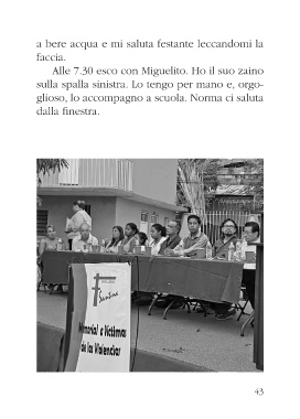 a bere acqua e mi saluta festante leccandomi la faccia. Alle 7.30 esco con Miguelito. Ho il suo zaino sulla spalla sinistra. Lo tengo per mano e, orgo- glioso, lo accompagno a scuola. Norma ci saluta dalla finestra. 43
